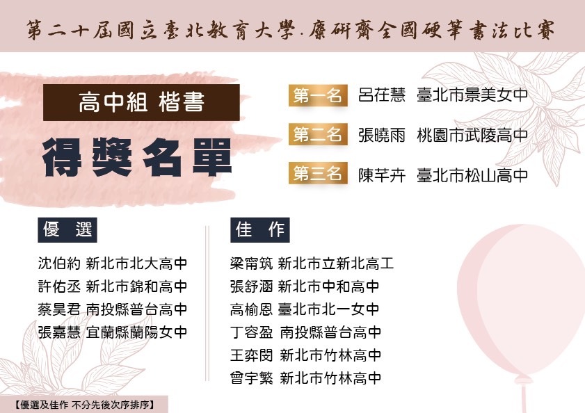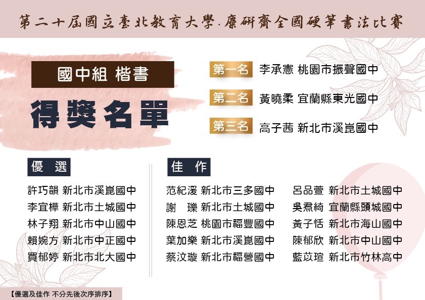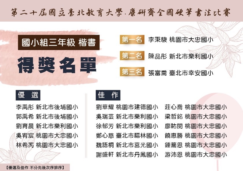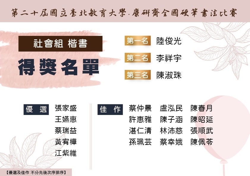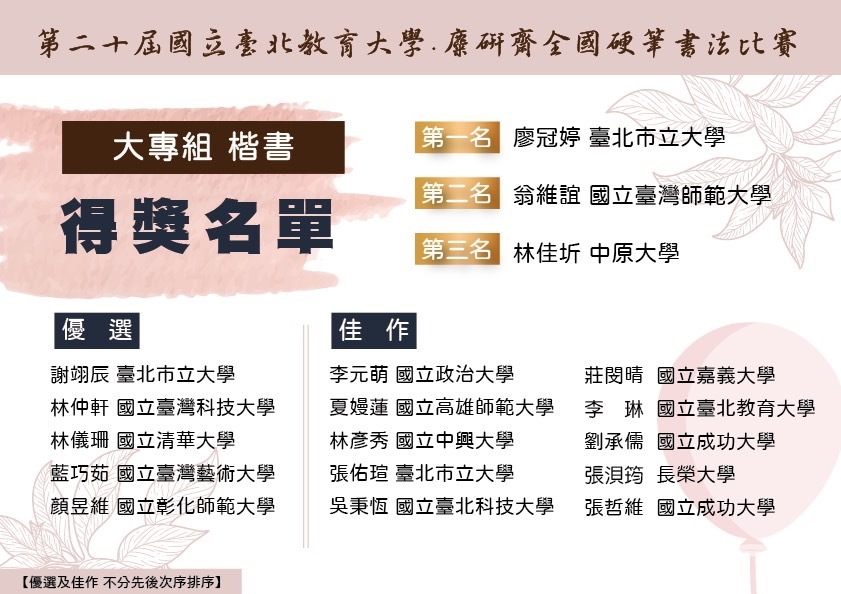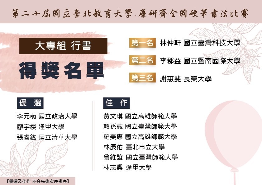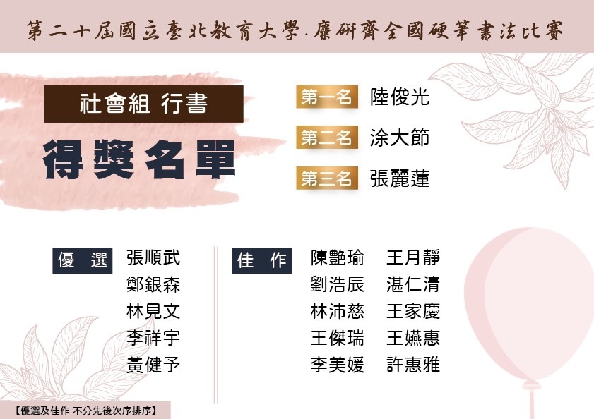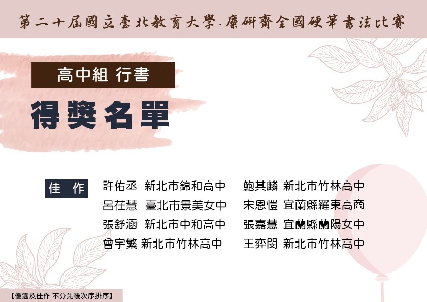 【第二十屆國立台北教育大學.麋研齋全國硬筆書法比賽】