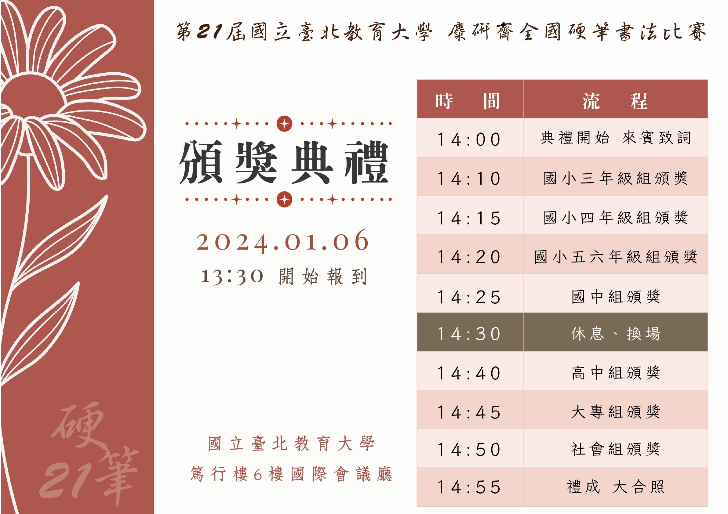 ★ 頒獎地點:國立臺北教育大學-篤行樓6F國際會議廳 (臺北市大安區和平東路二段134號)