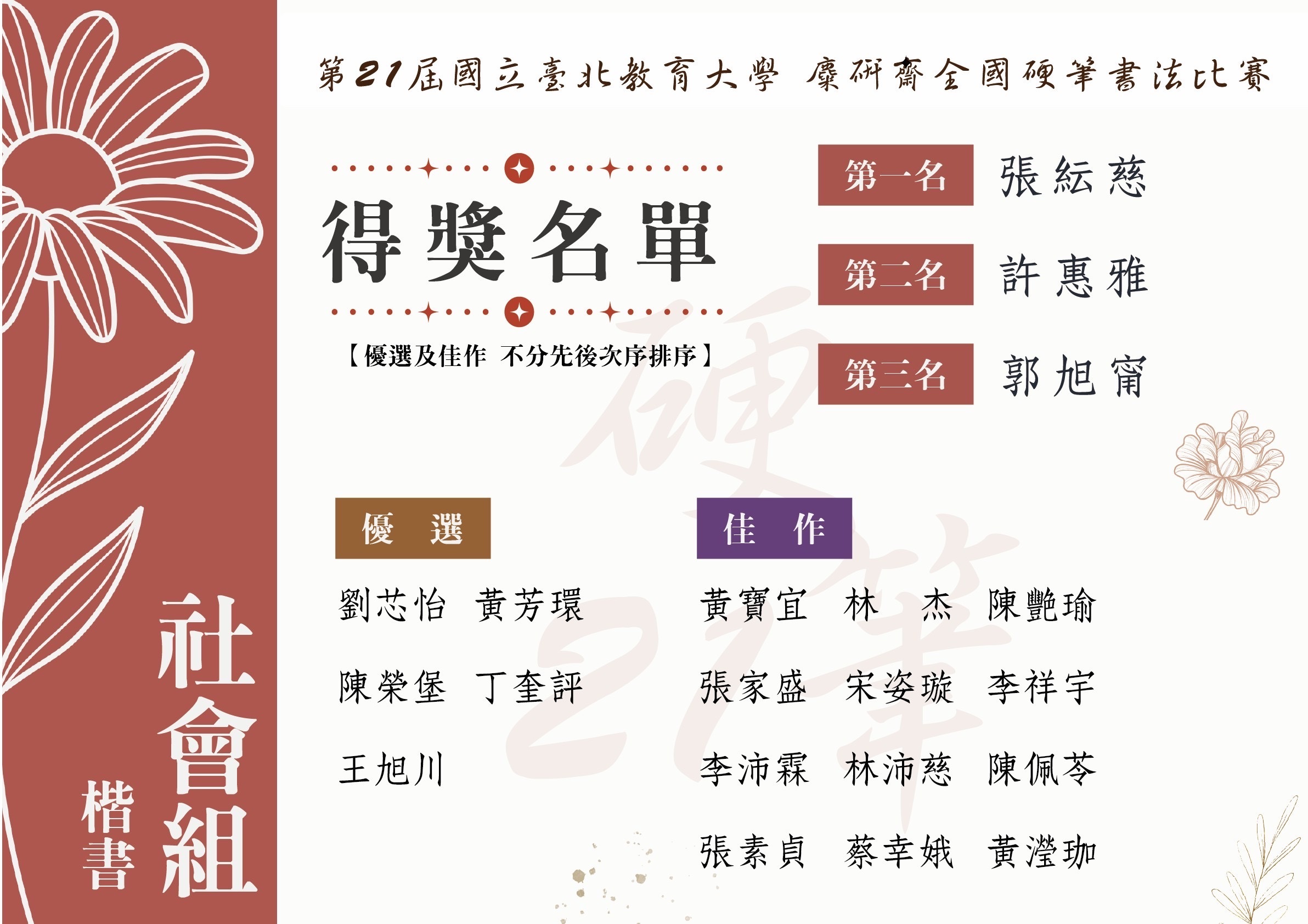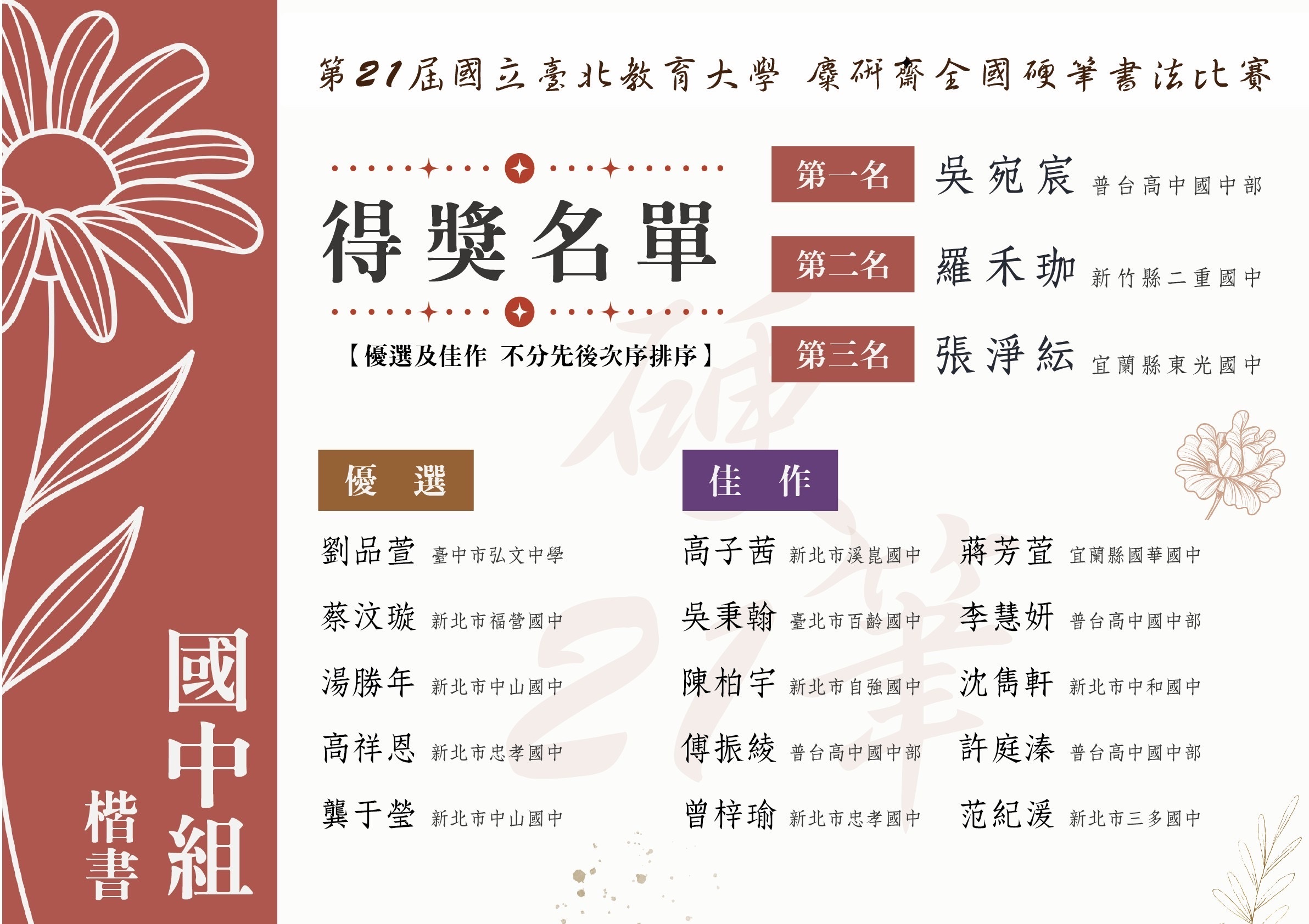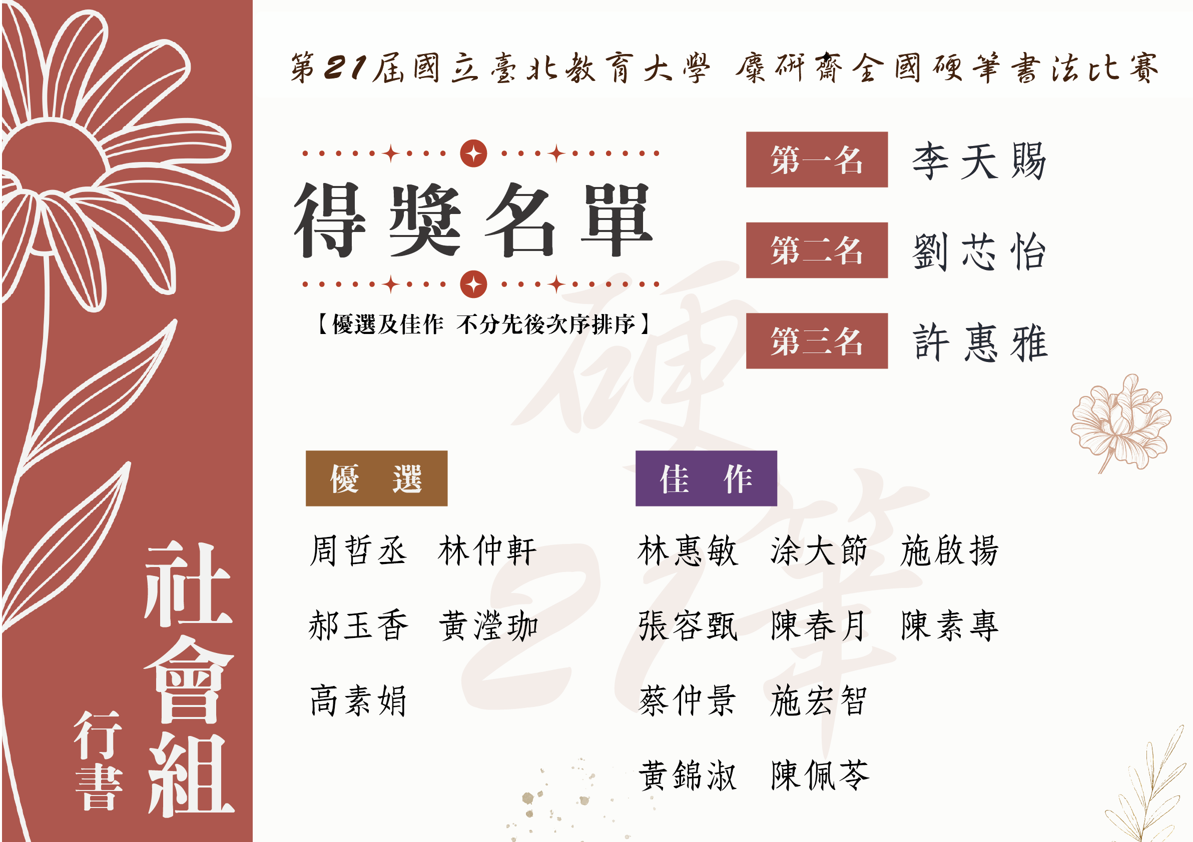 【第二十一屆國立台北教育大學.麋研齋全國硬筆書法比賽】
