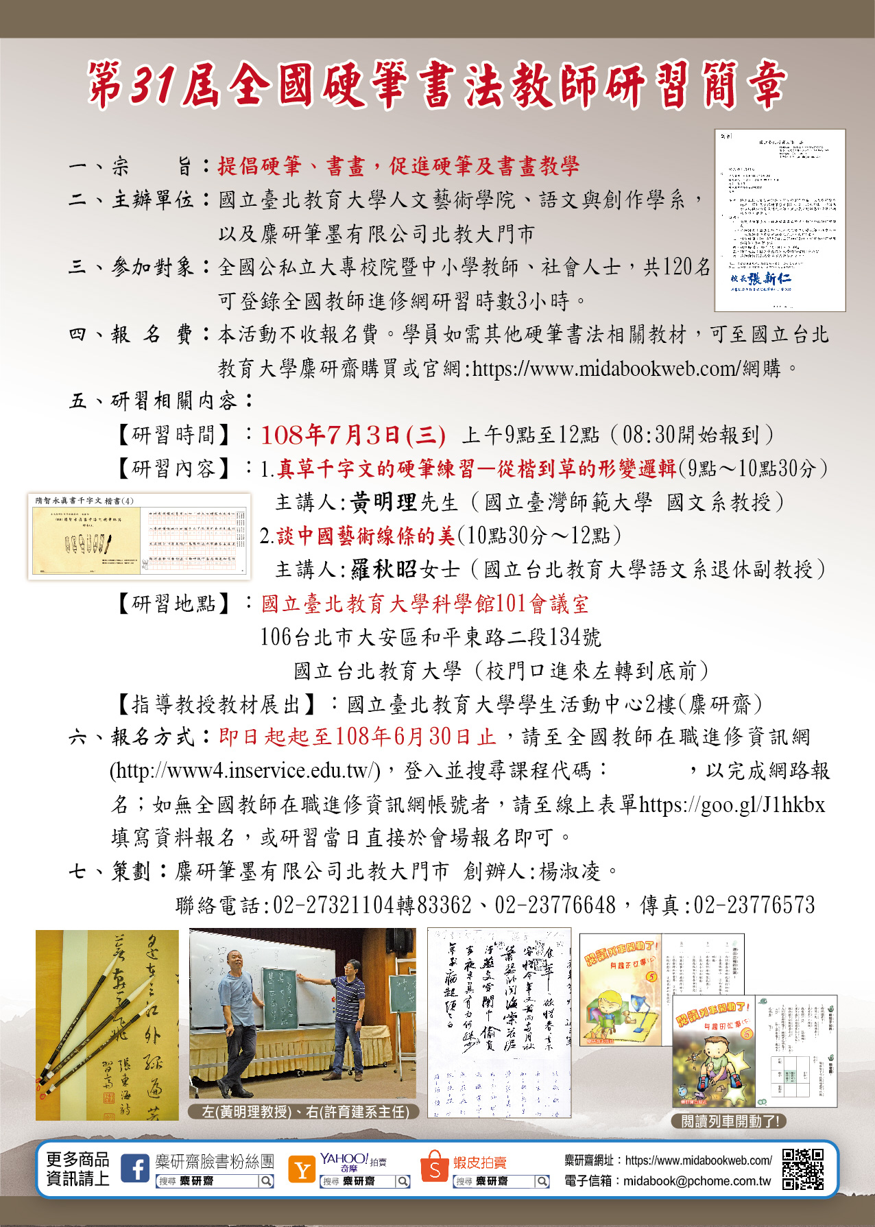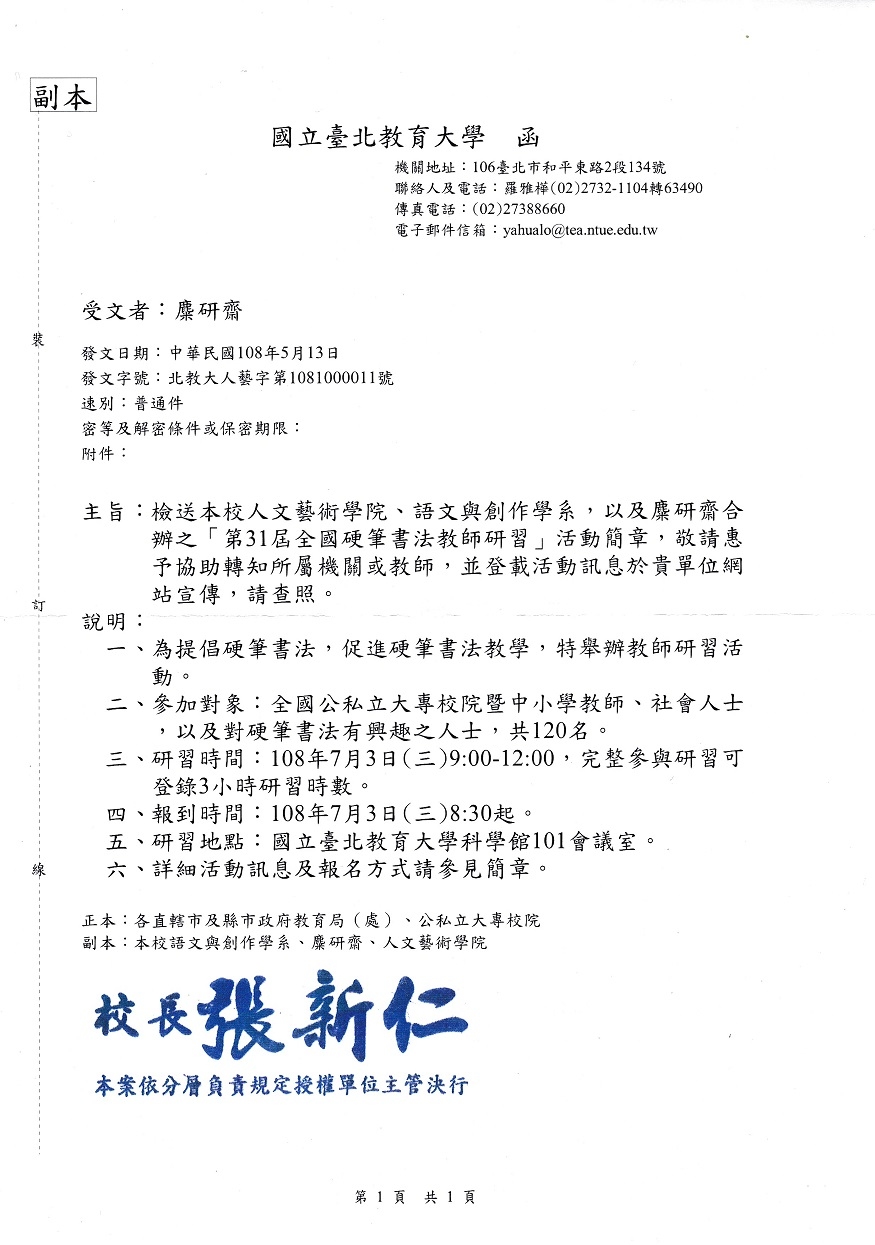 四、報名費:本活動不收報名費。學員如需其他硬筆書法相關教材,可至國立台北教育大學麋研齋購買或官網:https://www.midabookweb.com/網購。