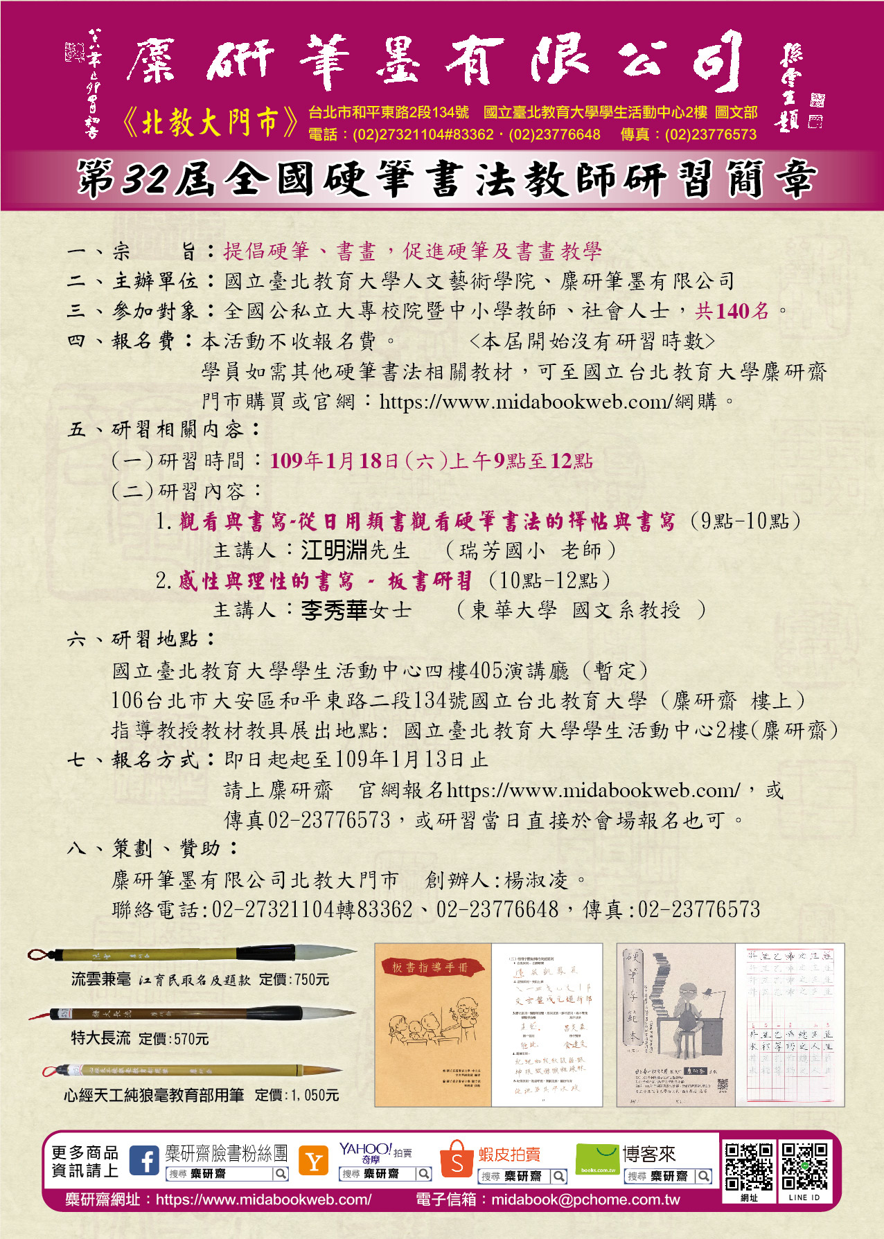 四、報名費:本活動不收報名費。學員如需其他硬筆書法相關教材,可至國立台北教育大學麋研齋購買或官網:https://www.midabookweb.com/網購。