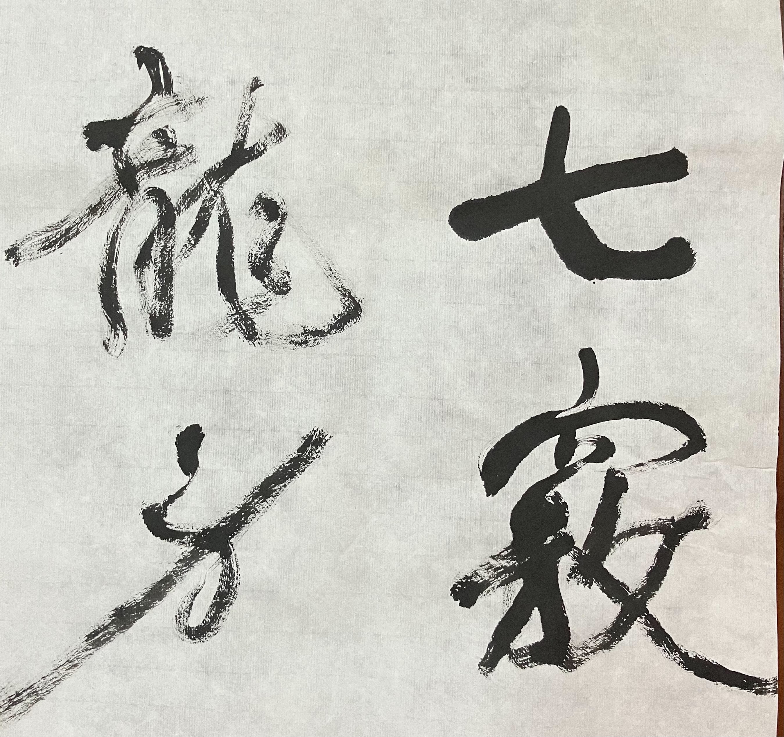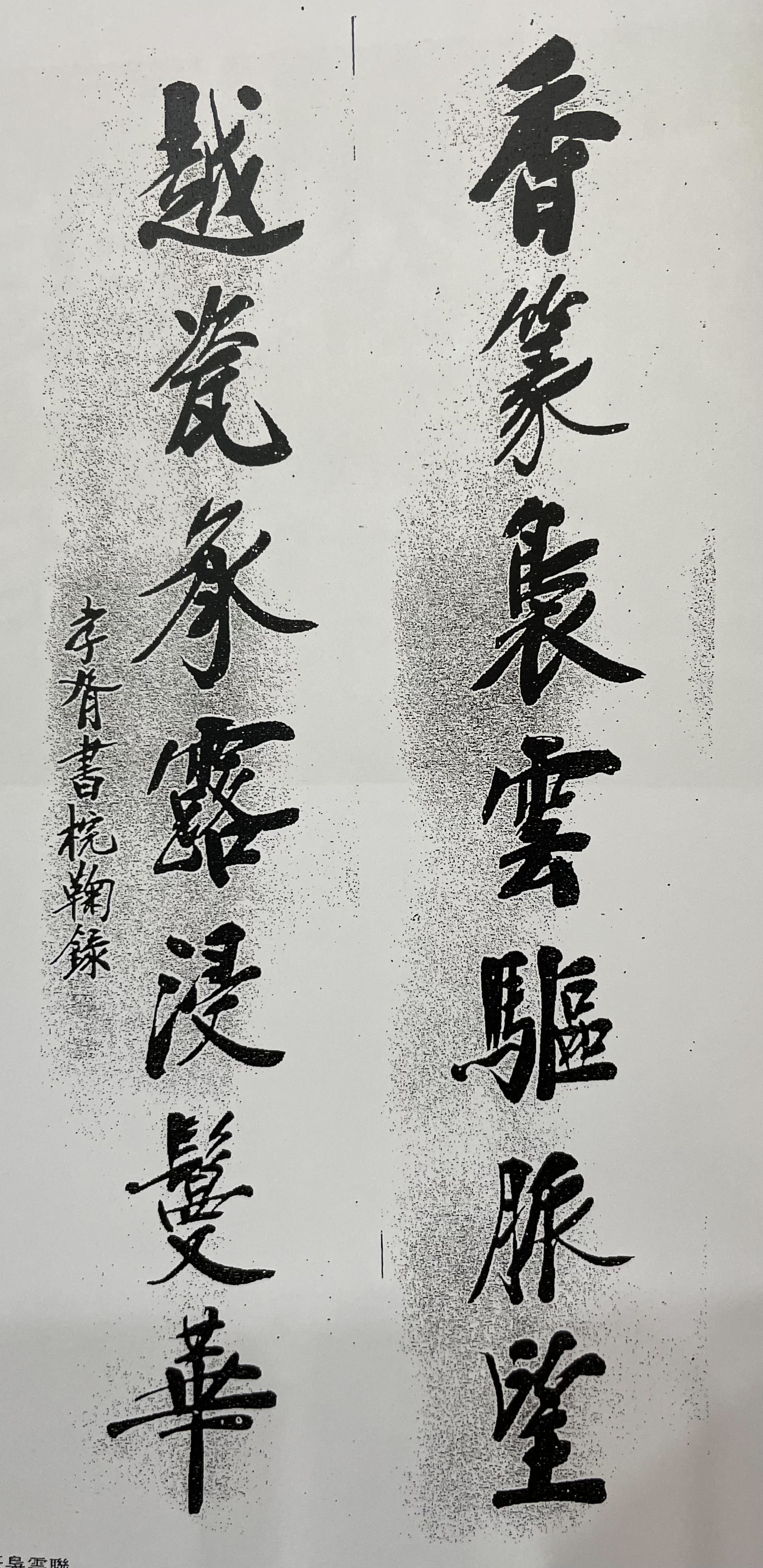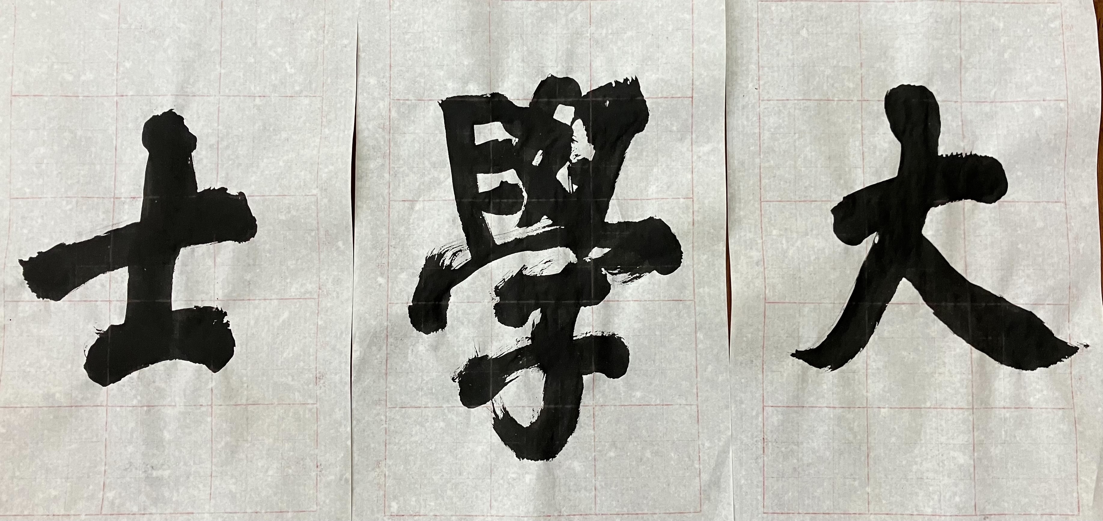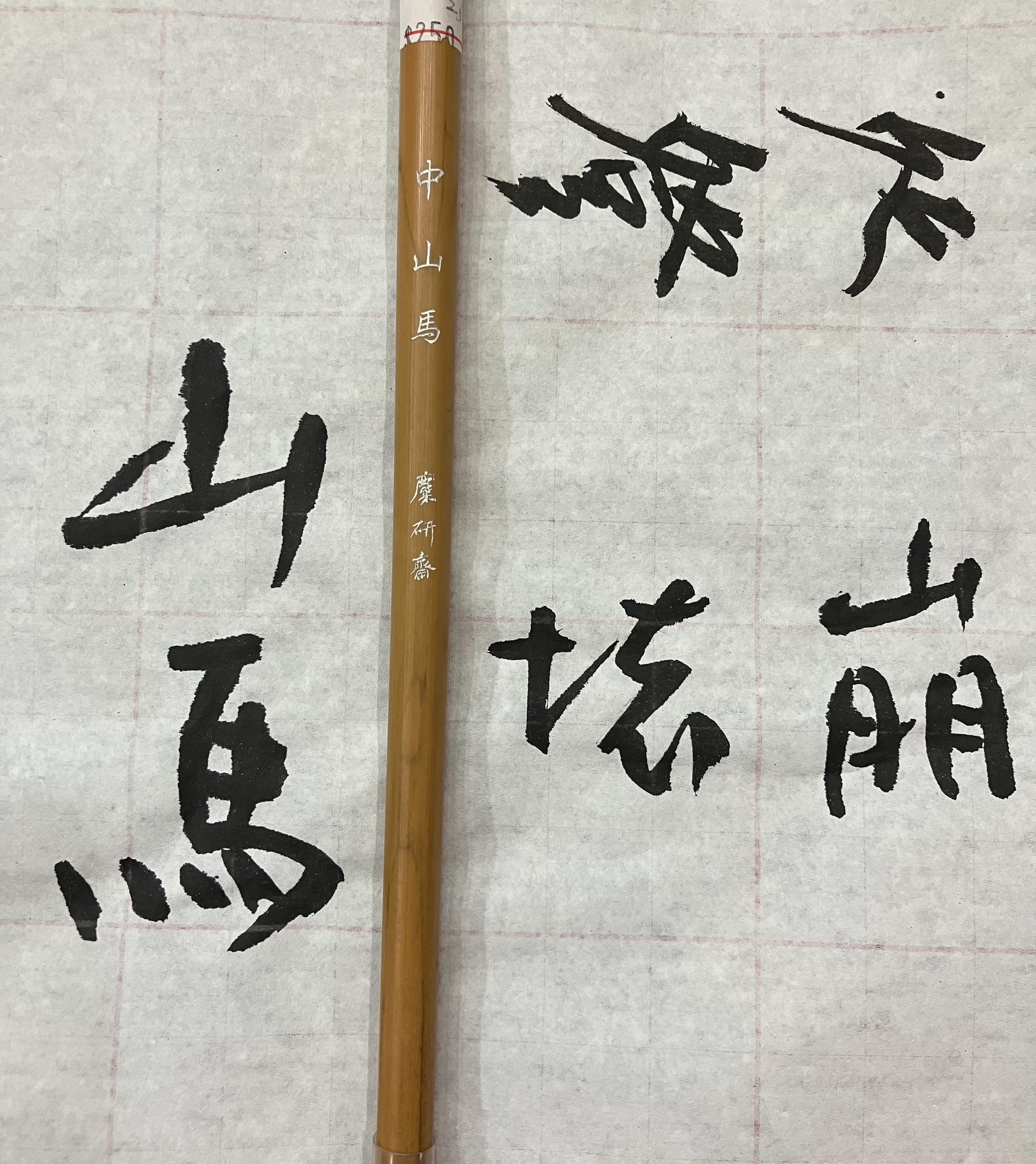 指導教授:江育民。文:楊淑凌。又是雙十連假,哈哈!!大家還是非常踴躍來上課,麋研齋的學員就是不同,難怪每個人都寫得一手好書法好硬筆字,好學精神令人折服。今天江育民老師在前30分鐘的課程上指導他最拿手的篆書,(翁方綱)篆書大對聯,字帖的第5頁,用麋研齋羊毫筆,大霜重書寫,不用懸腕,輕鬆下筆,接著寫第13頁,(錢泳)的隸書大對聯,錢泳1754年間書法家,字體莊秀.典雅.優美,江老帶領大家認識他的大隸書,雖然名氣不是最大,但隸書寫的也是不俗喔!8開宣紙寫2個字,老師也用中蘭竹來示範,技法:鬆。課堂上留有江老師示範的字,拍下提供學員分享。