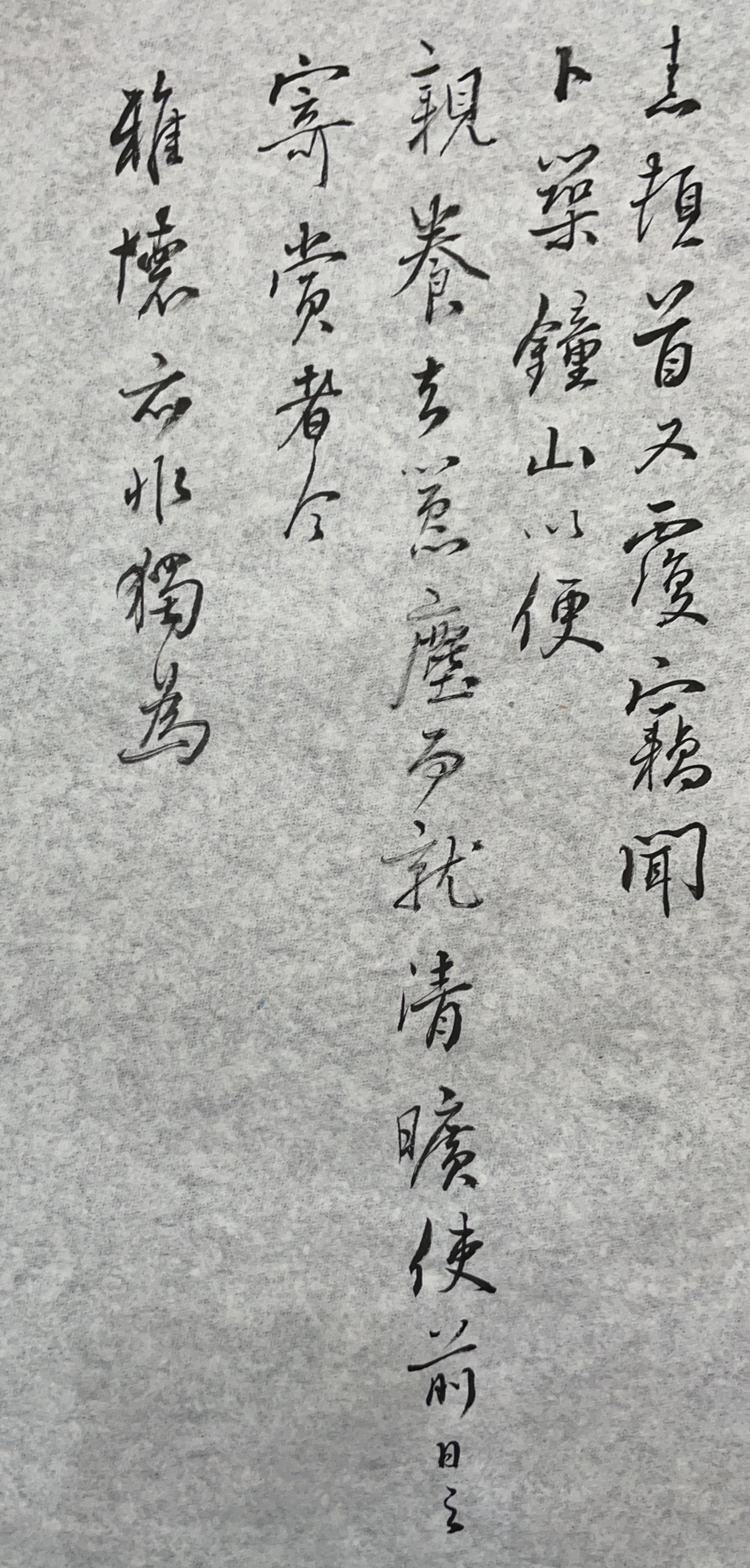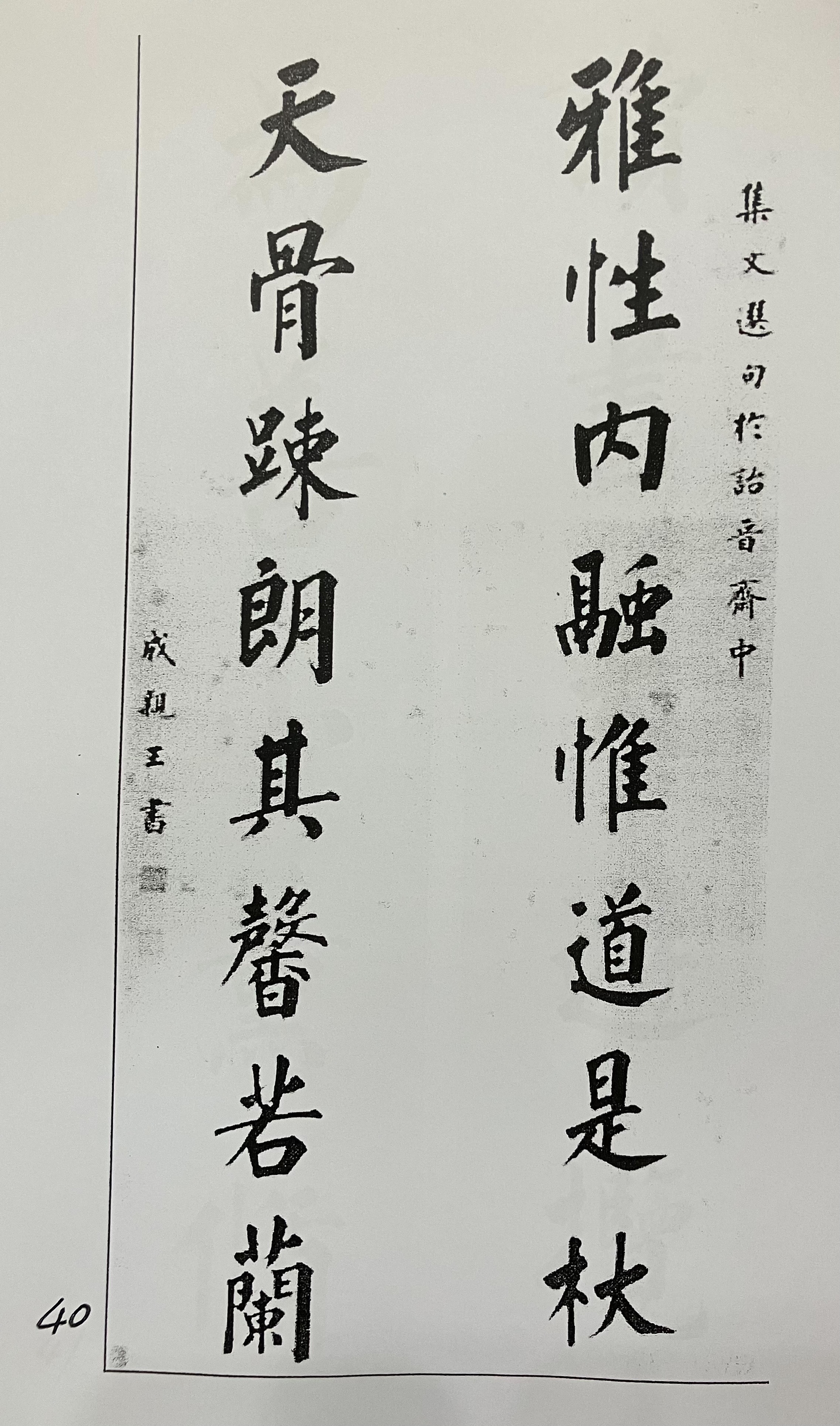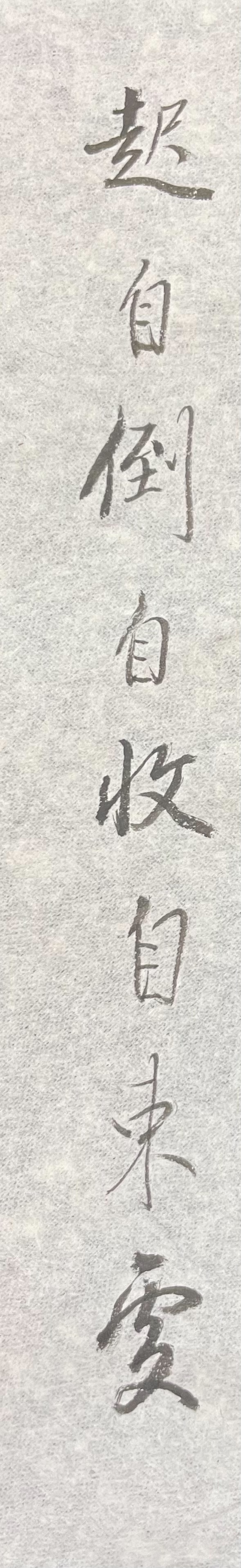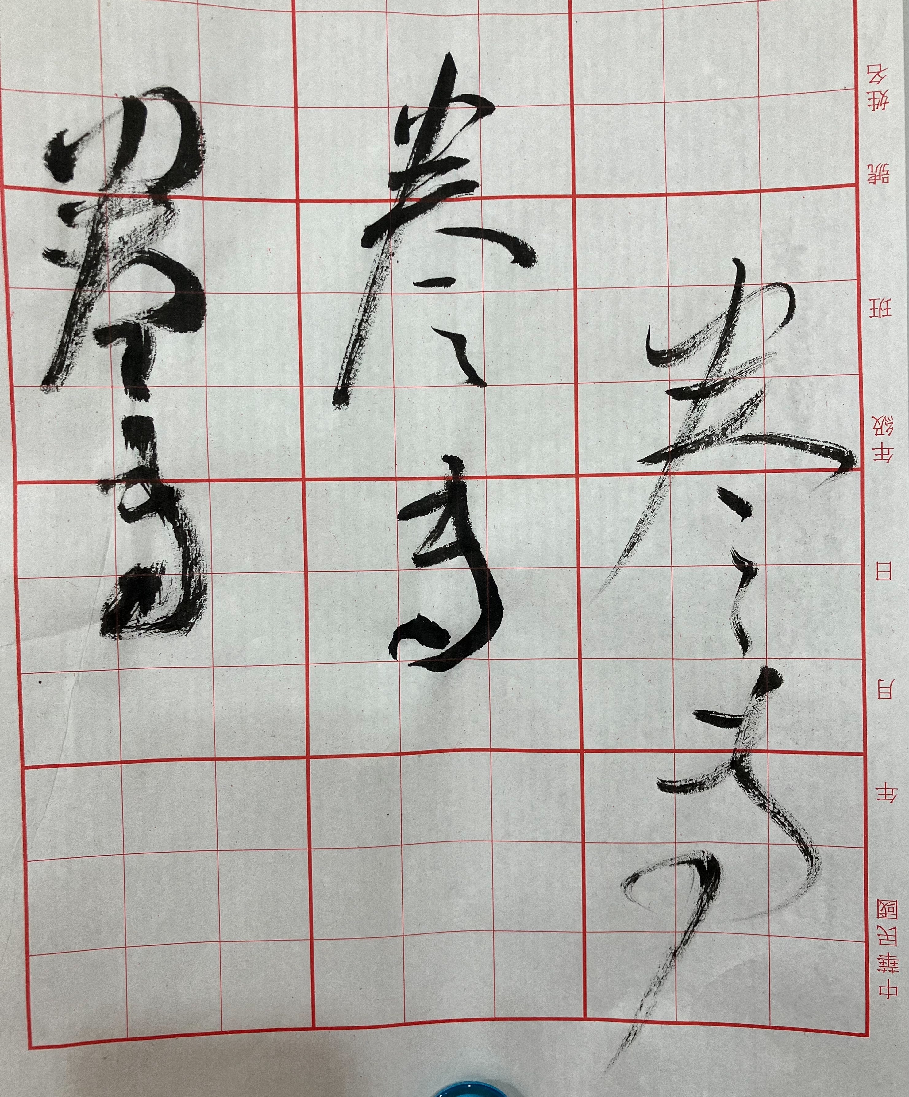 指導教授:江育民。文:楊淑凌。又是雙十連假,哈哈!!大家還是非常踴躍來上課,麋研齋的學員就是不同,難怪每個人都寫得一手好書法好硬筆字,好學精神令人折服。今天江育民老師在前30分鐘的課程上指導他最拿手的篆書,(翁方綱)篆書大對聯,字帖的第5頁,用麋研齋羊毫筆,大霜重書寫,不用懸腕,輕鬆下筆,接著寫第13頁,(錢泳)的隸書大對聯,錢泳1754年間書法家,字體莊秀.典雅.優美,江老帶領大家認識他的大隸書,雖然名氣不是最大,但隸書寫的也是不俗喔!8開宣紙寫2個字,老師也用中蘭竹來示範,技法:鬆。課堂上留有江老師示範的字,拍下提供學員分享。
