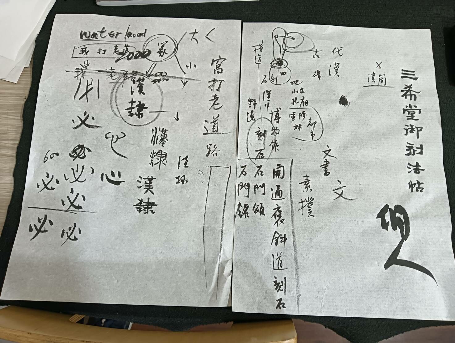 指導教授:江育民。文:楊淑凌。雖然中秋連假同學們還是非常踴躍來上課,還有剛從義大利旅行回來就趕來上課的同學,真讓人感動喔!今天延續寫上週的新帖,第20頁(桂馥)隸書。技法:逆勢、側峰寫。筆畫不要寫直式往上,他是有弧度的,而且是莊重的,了解這些原則大致上就可掌控重點了。隸書通常會用霜重(大)羊毫毛筆來寫。8開宣紙或毛邊紙寫2個字,熟練後再寫字帖上的對聯,如此才能看到整體的作品風格。今天江育民老師還用了(王北岳迎春紀念毛筆來書寫),上課中也講了許多山東曲阜摩、天水、漢中、四川有趣的野逸書法史,附上下課後桌面上留下的江老師手稿提供參考。小編覺得:每堂課都是如此精采也難怪同學們都珍惜每次的課程相聚啊!