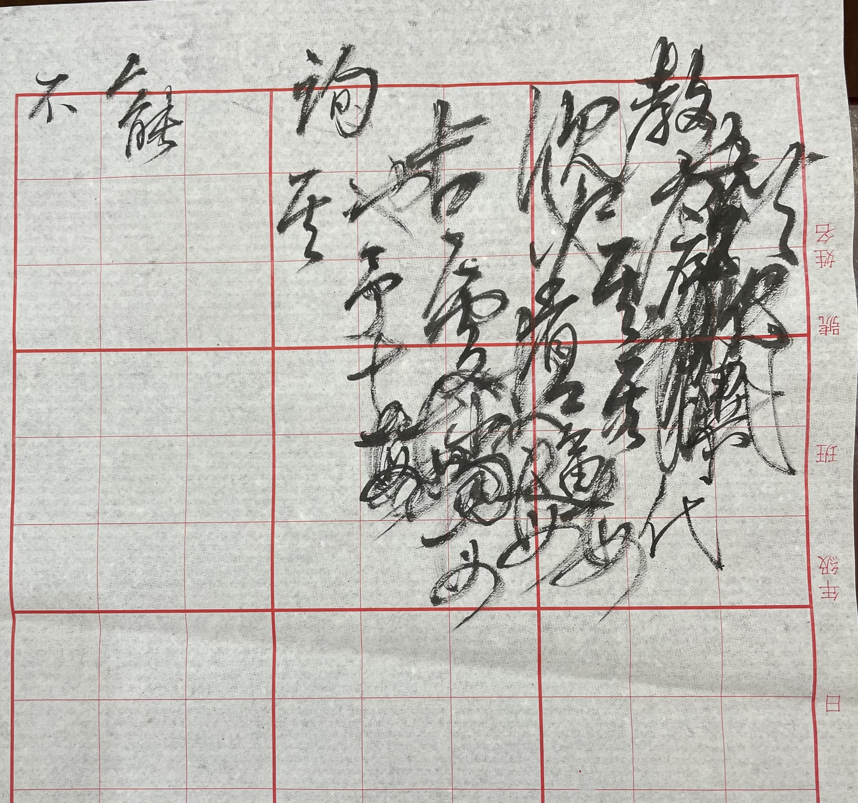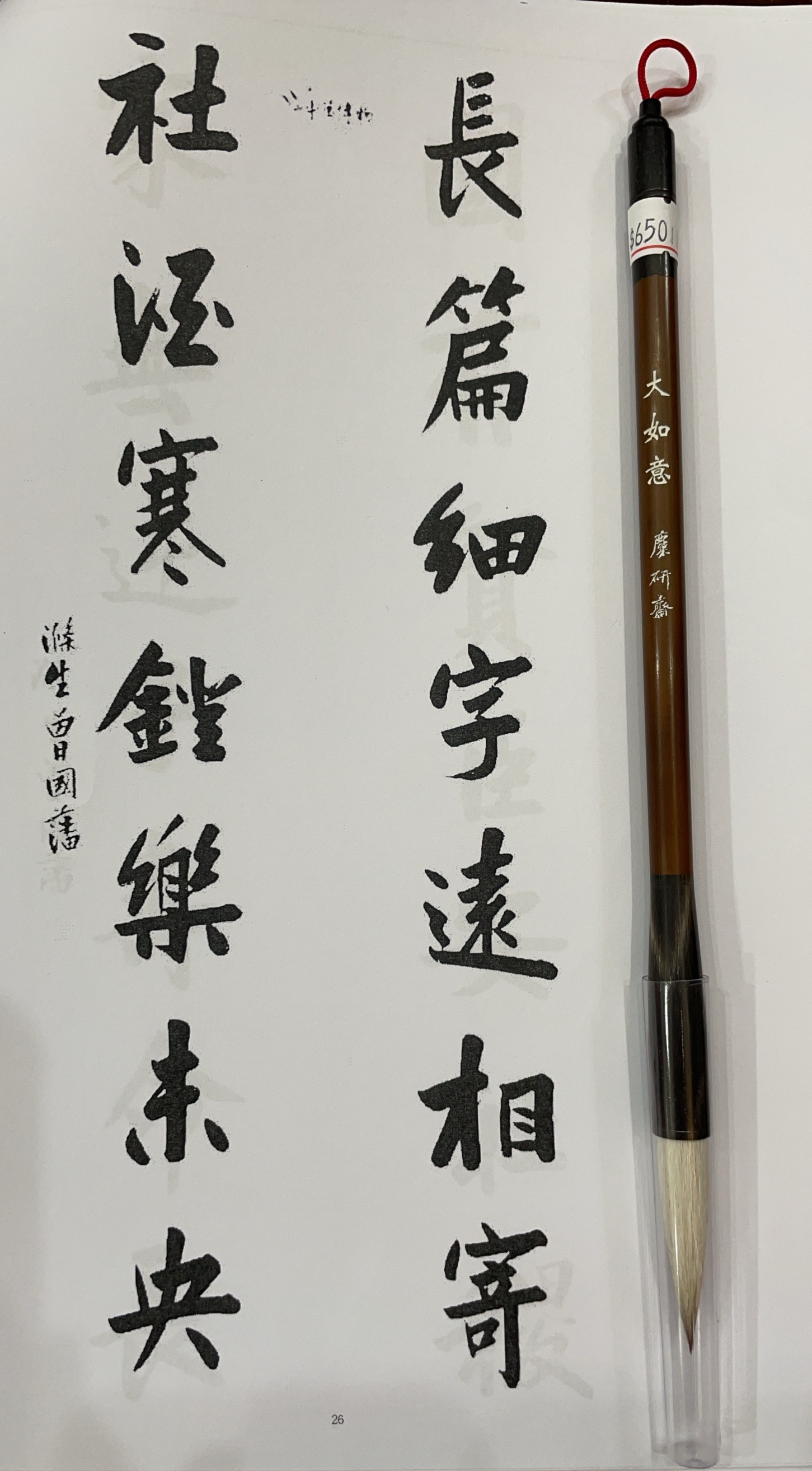 指導教授:江育民,作業不變,(元 鮮于樞 醉時歌 行書),技法:放鬆,示範工具:麋研齋大如意,機制宣、毛邊紙。現場書寫第11頁,旁邊也留下江老師的硬筆字,下面照片提供參考: